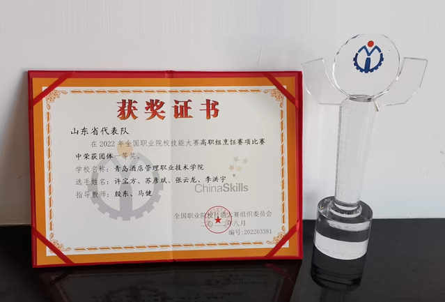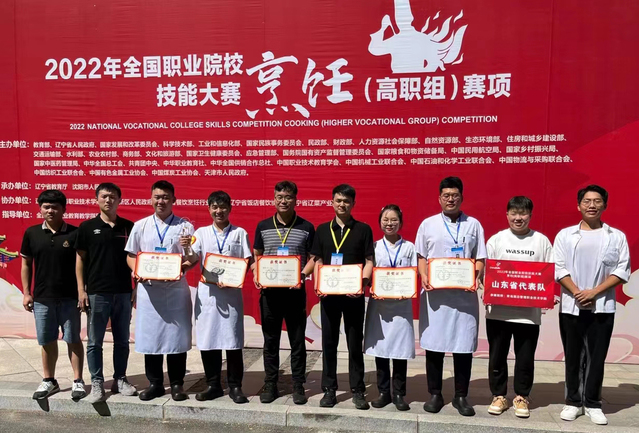 本网讯(烹饪学院 赵捷)8月20日至24日,2022年全国职业院校技能大赛(高职组)烹饪赛项在辽宁现代服务职业技术学院举行,万象城官网烹饪学院学生许宝方、苏彦斌、张云龙、李洪宇组成的参赛团队凭借宴席作品《山海共融·美丽乡村》荣获一等奖,殷东、马健老师荣获“优秀指导教师”。
