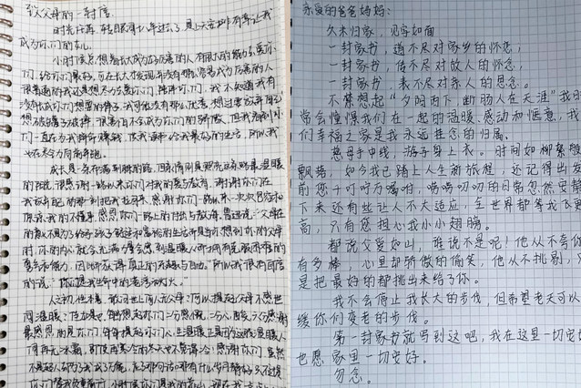 一封家书,道不尽的感恩之情。在感恩教育活动的号召下,同学们拿出纸笔,用最朴素的方式表达最不平凡的爱。来自山东临沂的杨晨同学在给父母的信中动容地写道:“他们给了我满怀的勇气与温暖,自己却偷偷迎下了一场场风雨。爸爸和太阳都只有一个,妈妈和月亮都只有一个,我想让他们慢些走,给我时间保护他们。”一信纸笺,情真意切,成为新生对父母的感恩传声筒。