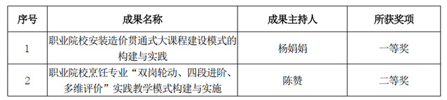 学校高度重视青岛市教学成果奖的培育和申报工作,多次组织教学成果奖培训会,邀请省内外职教专家指导申报材料,历经多轮梳理、创新、凝练和打磨,在2021年度院级教学成果奖获奖成果中遴选六项申报市级教学成果奖。经个人申报、初评推荐、市级复评,最终学校两项成果获奖。其中,杨娟娟主持的《职业院校安装造价贯通式大课程建设模式的构建与实践》荣获一等奖,陈赞主持的《职业院校烹饪专业“双岗轮动、四段进阶、多维评价”实践教学模式构建与实施》荣获二等奖。