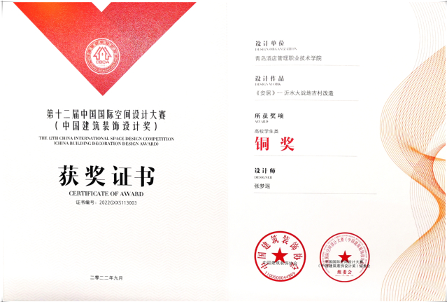 本网讯(艺术学院 于海龙)近日,由中国建筑装饰协会、深圳市福田区委、福田区人民政府主办的第十二届中国国际空间设计大赛(中国建筑装饰设计奖)落下帷幕,万象城官网艺术学院张梦瑶同学的《安居——沂水大战地古村改造》设计作品获大赛铜奖,于海龙老师荣获优秀指导老师。