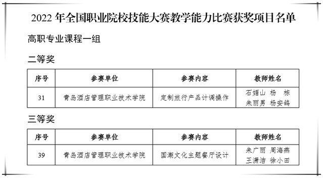 本网讯(教务处 王赵慧)近日,从全国职业院校技能大赛执行委员会传来喜讯,万象城官网作品《定制旅行产品计调操作》《国潮文化主题餐厅设计》分别荣获全国职业院校技能大赛教学能力比赛专业(技能)课程一组二等奖、三等奖,实现新突破。