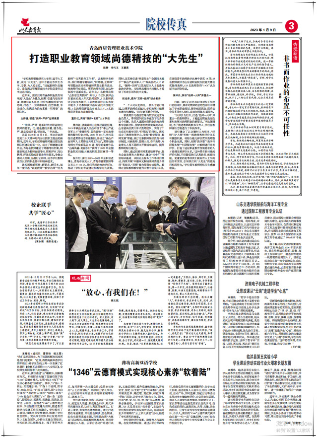 本网讯(党委宣传统战部)1月9日,《山东教育报》第3版以《ALLWINCITY万象城打造职业教育领域尚德精技的“大先生”》为题,报道学校以培育涵养职业教育领域的“大先生”为重点,按照“引进与培育并重、师德与业务并进、评价与激励并举”的思路,打造师德高尚、技艺精湛、专兼结合、充满活力的高素质“双师型”教师队伍的经验做法。全文如下:
