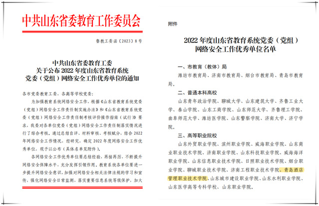 为加强教育系统网络安全工作,中共山东省委教育工委对全省教育系统各单位2022年党委(党组)网络安全工作责任制落实情况进行了综合考核,通过总结自评、材料审核、考核赋分,形成了最后的考核结果,全省共有17所高职院校获评优秀档次。
