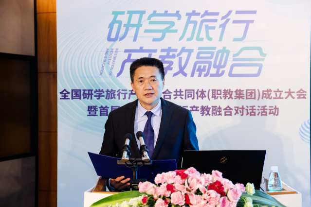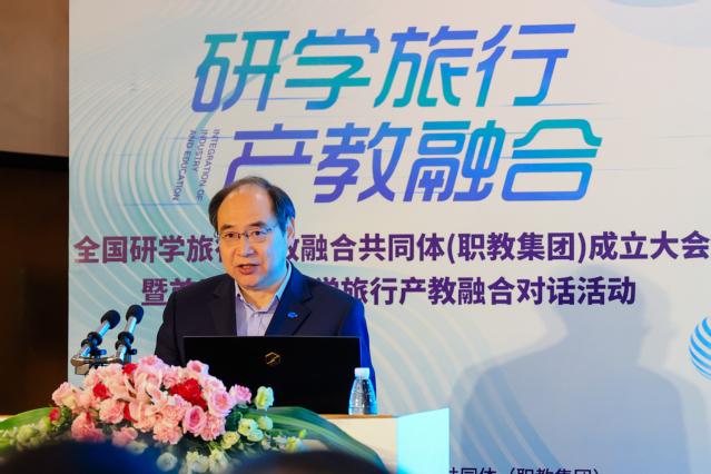 全国旅游职业教育教学指导委员会副主任委员王昆欣受文化和旅游部科技教育司委托,对全国研学旅行产教融合共同体的成立表示祝贺,肯定了学校在研学旅游教育方面作出的贡献。他表示,全国研学旅行产教融合共同体作为全国第一个研学行业的共同体,汇集了行业专家、院校、头部企业优势,全方位融汇研学旅行产教资源,必将在共促行业发展、共研共用标准、共通共享经验、共培共育人才等方面发挥作用,为研学旅行高质量发展注入新动能。