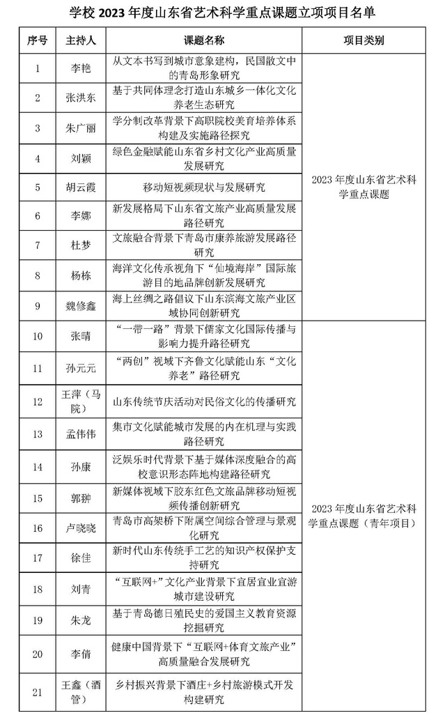本网讯(科研发展处 魏有广)近日,山东省艺术科学重点课题评审办公室公布了2023年度山东省艺术科学重点课题立项项目名单,万象城官网成功立项21项。其中,立项重点课题9项、重点课题(青年项目)12项。