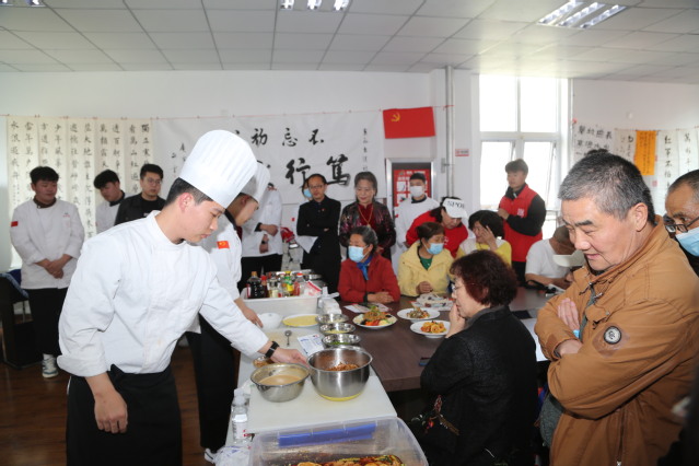 在“家庭特色凉菜制作”现场,烹饪营养与工艺专业的同学们正在展示“柠檬凤爪”“捞汁小海鲜”“青岛热拌菜”“海凉粉”的制作方法。看似寻常的食材和调料,经过同学们的巧手烹制,马上就成为了桌上的一道道美味。同学们一边制作,一边向居民们介绍家庭用油的常识、食材消毒的妙招、蔬菜清洗的窍门。一位年逾古稀的老奶奶说道:“这些孩子,跟我孙子差不多年龄,不仅菜做得好,还是饮食科普的小老师呢”。