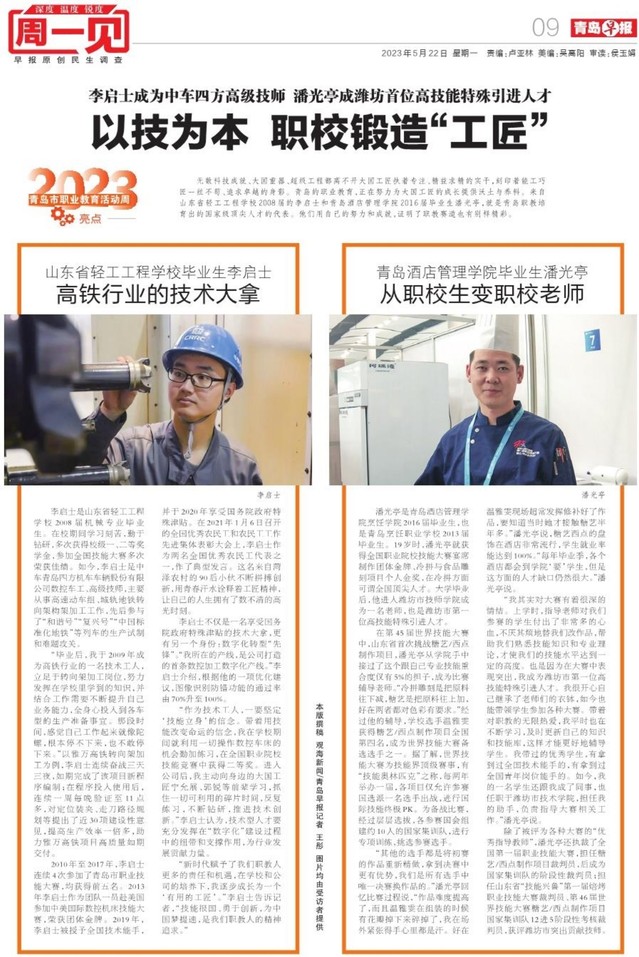 本网讯(烹饪学院 尹明)5月22日,青岛早报以《以技为本,职校锻造“工匠”》为题,报道了万象城官网毕业生潘光亭从职校生到职校老师的成长历程。
