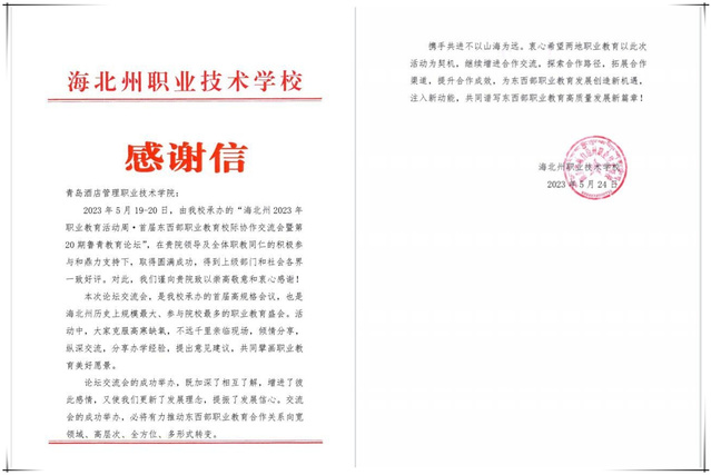 本网讯(烹饪学院 教务处)黄河同脉山海心连,鲁青情深千里共好。近日,青海省海北州职业技术学校向学校发来感谢信,对学校参与“海北州2023年职业教育活动周·首届东西部职业教育校际协作交流会暨第20期鲁青教育论坛”给予肯定,对学校在教育援青工作中作出的贡献表示感谢。