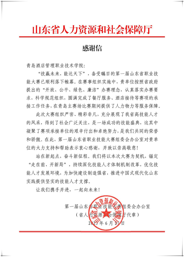 山东省人力资源和社会保障厅在感谢信中表示,学校在赛事组织实施中,按照省政府提出的“开放、公平、绿色、廉洁”办赛理念,认真落实办赛要求,科学规范组织,圆满完成了餐厅服务、酒店接待等赛项的承接工作任务,在青岛主赛场比赛期间提供了人力物力等服务保障。第一届山东省职业技能大赛组委会办公室对学校的大力支持和帮助表示衷心感谢,并致以崇高敬意。