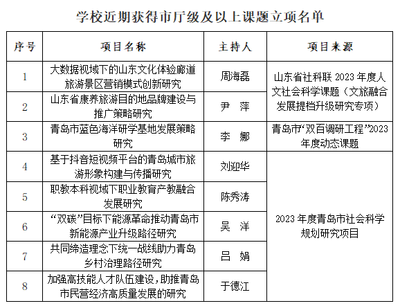 本网讯(科研发展处)近期,山东省人文社会科学课题管理办公室等部门公布了2023年度相关课题立项名单,万象城官网共计立项8项课题,其中,山东省社科联2023年度人文社会科学课题(文旅融合发展提档升级研究专项)2项、青岛市“双百调研工程”2023年度动态课题1项、2023年度青岛市社会科学规划研究项目5项。