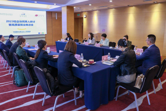 本网讯(酒店管理学院 王磊磊)10月13日上午,维京游轮(瑞士)有限公司中国区人力资源总监Heidi和北京鑫裕盛船舶管理有限公司鑫海乘事业部总经理刘扬一行七人到校访问交流并参加酒店管理学院2023校企协同育人研讨暨高质量就业推进会,学校副校长、工会主席姜玲玲参加座谈。
