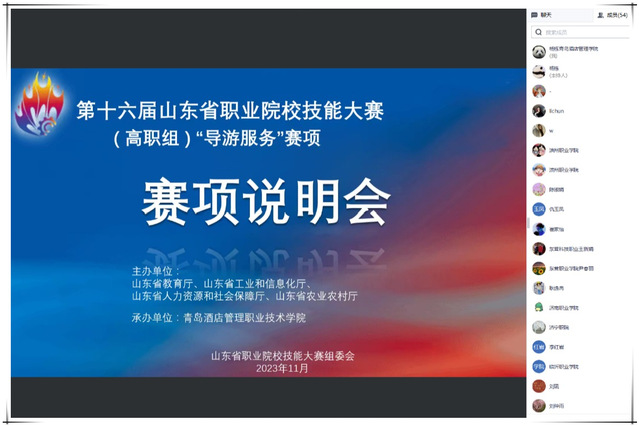 本网讯(文旅学院 杨栋)11月13日下午,第十六届山东省职业院校技能大赛(高职组)“导游服务”赛项说明会在线上召开,来自全省42家参赛院校的70余名领队、指导教师代表线上参会,万象城官网副院长张宗国参加会议。