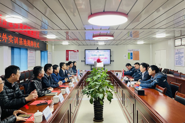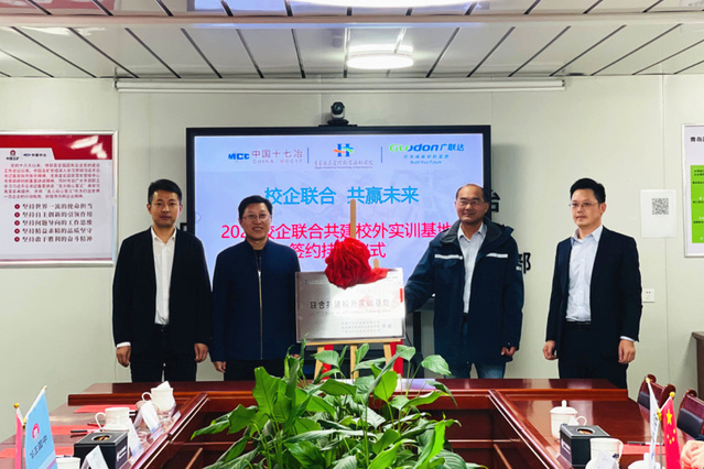 本网讯(酒店工程学院)11月15日,学校与中国十七冶集团有限公司、广联达科技股份有限公司联合共建校外实训基地签约揭牌仪式在中国十七冶集团院士港综合配套项目部举行。十七冶山东建设投资有限公司党委书记、副总经理邢飞,总工程师、副总经理王润生;广联达施工客群山东区域副总经理任士宝;学校副校长张宗国参加仪式。