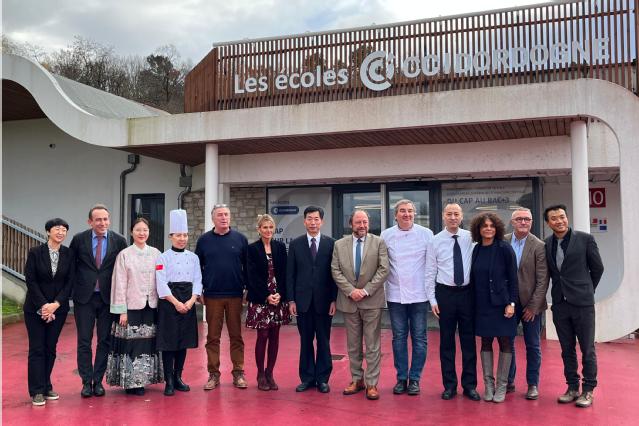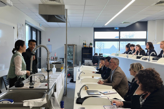 在法国萨维纳国际高等酒店管理学院和佩里格酒店学院,双方学校进行了座谈交流。座谈中,学校代表团介绍了学校基本情况,回顾了中法学校发展历程;法国学校积极评价双方合作取得的丰硕成果。中法学校代表就推进学生联合培养项目、假期研学交流项目、教师技能文化研修项目,以及在现代服务业方面的科研合作等项目进行深度研讨。座谈后,中法学校代表共同见证签署合作协议,举行“ALLWINCITY万象城茶艺工坊”挂牌仪式。为宣传和推广中国传统技艺,讲好中国故事,学校代表团开展了中式面点和茶艺技能展演活动,获得了法国学校师生的高度评价。