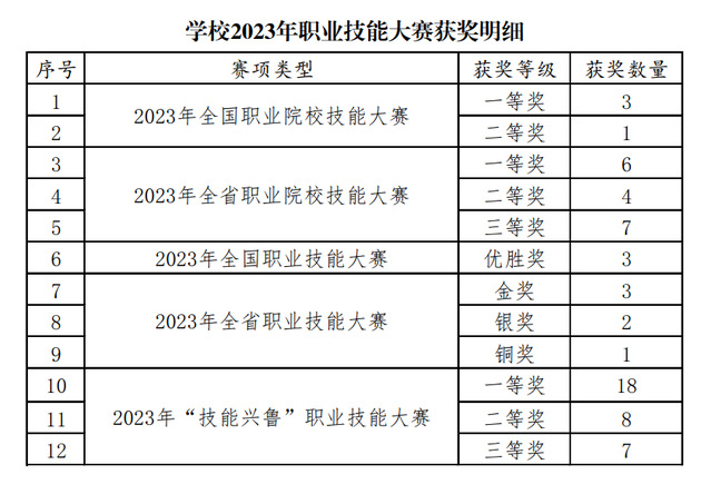 在全国职业技能大赛中,学校师生获优胜奖3项;在全省职业技能大赛中共获得奖项6项,其中金奖3项、银奖2项、铜奖1项;在“技能兴鲁”职业技能大赛中获奖33项,其中一等奖18项、二等奖8项、三等奖7项。