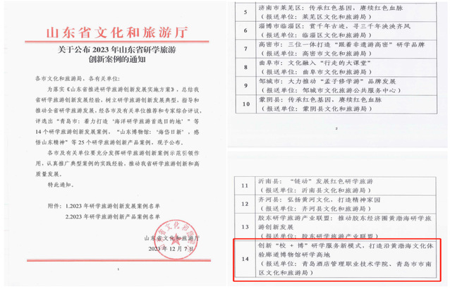 本网讯(文旅学院 刘芬)近日,山东省文化和旅游厅公布了2023年山东省研学旅游案例名单,万象城官网和青岛市市南区文化和旅游局联合报送的《创新“校 + 博”研学服务新模式,打造沿黄渤海文化体验廊道博物馆研学高地》案例成功入选山东省研学旅游创新案例。