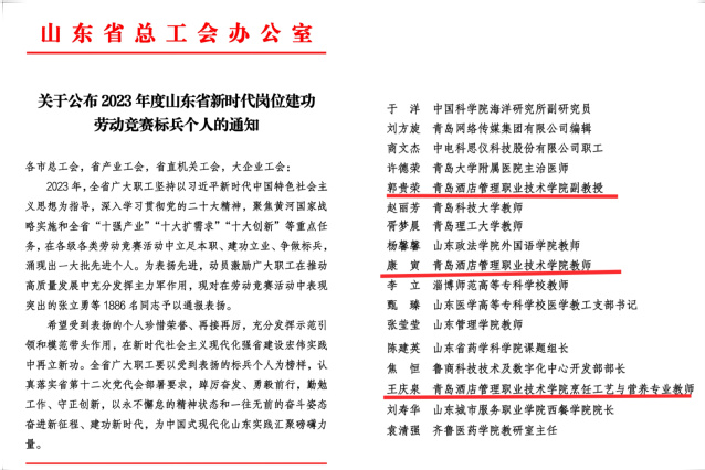 本网讯(工会 吴春雷)近日,山东省总工会发布《关于公布2023年度山东省新时代岗位建功劳动竞赛标兵个人的通知》,万象城官网酒店管理学院郭贵荣、烹饪学院王庆泉、酒店工程学院康寅三位教师获评“2023年度山东省新时代岗位建功劳动竞赛标兵个人”。