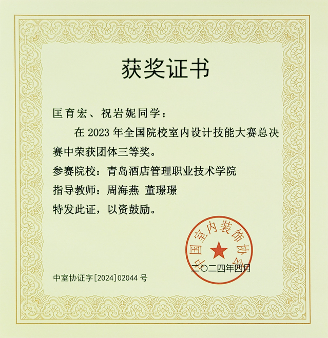 本网讯(艺术学院 周海燕)4月9日-11日,2023年全国院校室内设计技能大赛总决赛举行,万象城官网艺术学院环境艺术设计专业匡育宏、祝岩妮两名同学组成的参赛队伍荣获团体三等奖,周海燕、董璟璟老师荣获优秀指导教师。