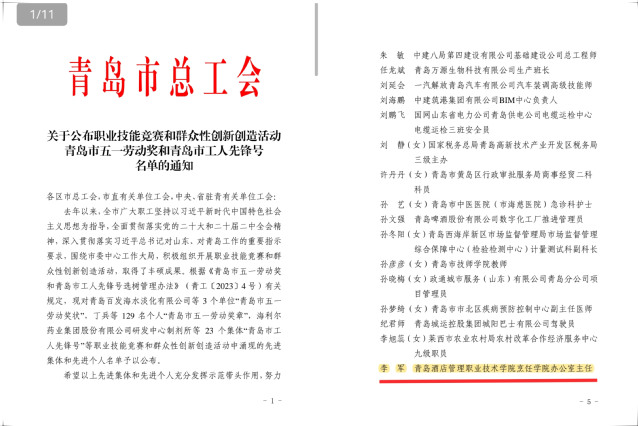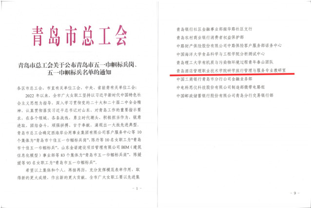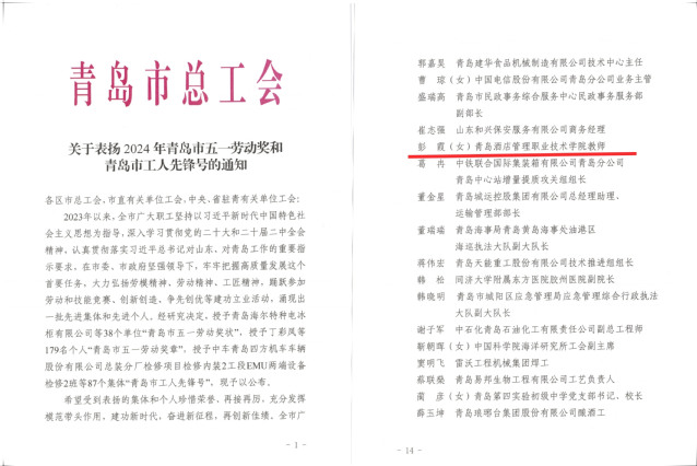 本网讯(工会 吴春雷)近日,青岛市总工会下发《关于表扬2024年青岛市五一劳动奖和青岛市工人先锋号的通知》《关于公布职业技能竞赛和群众性创新创造活动青岛市五一劳动奖和青岛市工人先锋号名单的通知》《青岛市总工会关于公布青岛市五一巾帼标兵岗、五一巾帼标兵名单的通知》,万象城官网烹饪学院李军、信息工程技术学院彭霞两名教师荣获“青岛市五一劳动奖章”,文旅学院研学旅行管理与服务专业教研室荣获“青岛市五一巾帼标兵岗”。