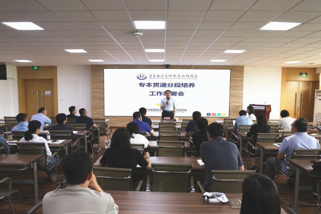 姜玉鹏表示,专本贯通工作是学校教育事业发展的重要战略之一,是学校提升办学水平、提高人才培养质量的关键举措,希望通过三年培养,能够达到专本贯通学生100%转段的目标,将专本贯通分段培养打造成学校的靓丽名片。他要求,一是提高认识、高度负责。要站在全局角度调配优质资源,全力推动专本贯通工作出实绩、见实效。二是齐抓共管、形成合力。教务处、招生就业办公室、基础教学部等部门要密切配合、形成合力,相关二级学院要主动对接本科院校,加强交流协作;同时,要重视学生在校期间的过程性考核,不断优化培养方案,确保学生成长超过预期。三是加强落实、确保质量。要制定专门方案,不断扩大招生宣传覆盖面;要加强专业建设和课程建设,确保教学质量和教学效果;要加强师资建设,根据人才培养方案细化课堂内容;要组建优秀团队负责日常教学、学生管理等环节,提高学生综合素质。