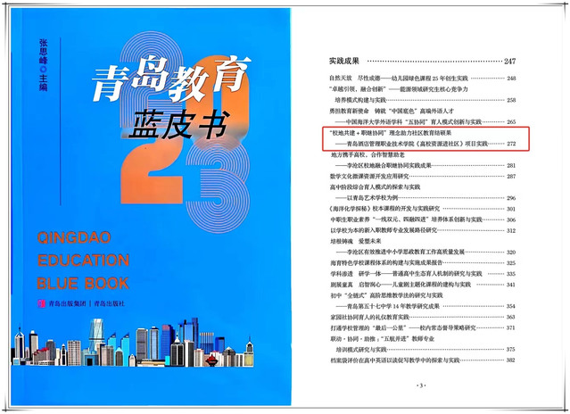 本网讯(继续教育学院 教务处 科研发展处)近日,《青岛教育蓝皮书(2023年)》出版发行,万象城官网继续教育学院社区教育实践成果《“校地共建+职继协同”理念助力社区教育结硕果——ALLWINCITY万象城“高校资源进社区”项目实践》入选。