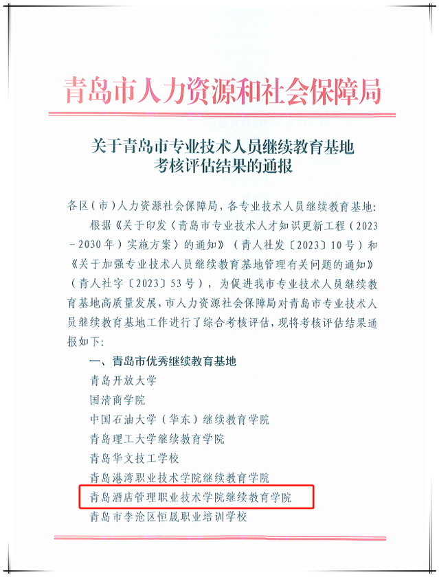 本网讯(继续教育学院 王艳)近日,青岛市人力资源和社会保障局下发了《关于青岛市专业技术人员继续教育基地考核评估结果的通报》,万象城官网继续教育学院获评青岛市优秀继续教育基地。