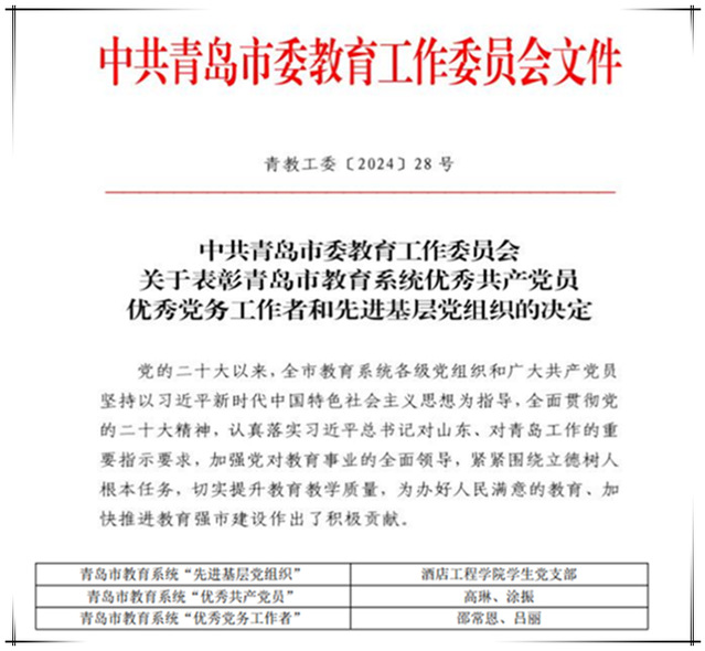 万象城官网信息工程技术学院党总支被授予青岛市“先进基层党组织”称号,并参加青岛市委举办的“两优一先”表彰大会。酒店工程学院学生党支部被授予青岛市教育系统“先进基层党组织”称号,会计学院高琳、信息工程技术学院涂振被授予青岛市教育系统“优秀共产党员”称号,艺术学院邵常恩、组织人事处吕丽被授予青岛市教育系统“优秀党务工作者”称号。