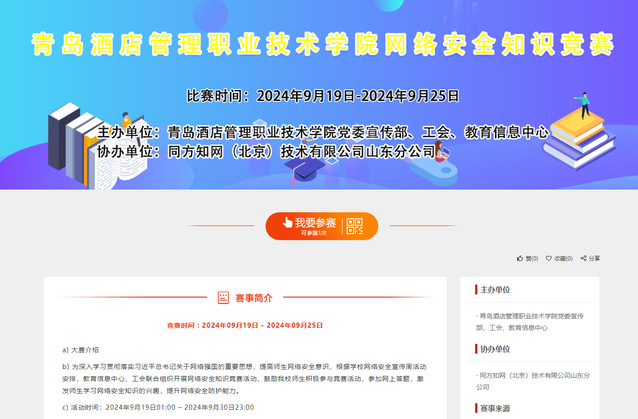 面向全校师生举办“网络安全知识竞赛”,竞赛分教职工组和学生组,通过有奖网络答题的方式普及网络安全知识,激发师生学习网络安全知识的兴趣,提升师生网络安全防护技能。组织学生参与“守护青春 网络有你”全国大学生网络安全知识答题活动;通过微信视频号、微博、快手、B站、抖音等平台参与观看“千万师生同上一堂网络安全教育课”;通过中国大学生在线官网学习资源库进行拓展学习,不断提升大学生安全用网、善于用网、文明上网能力素养。