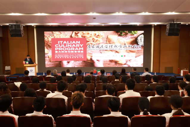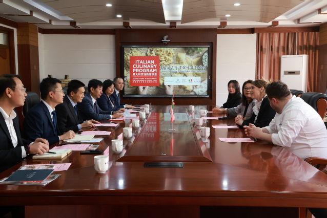 姜玉鹏对客人的到来表示欢迎,介绍了学校专业特色、人才培育和国际化办学情况。他表示,意大利烹饪教育项目有利于促进双方烹饪文化与教育的深度交流,拓宽师生国际视野,提升烹饪制作技艺,丰富餐饮感知体验;希望以此次活动为契机进一步深化合作,强化双方青年学子在饮食文化领域的互学互鉴。