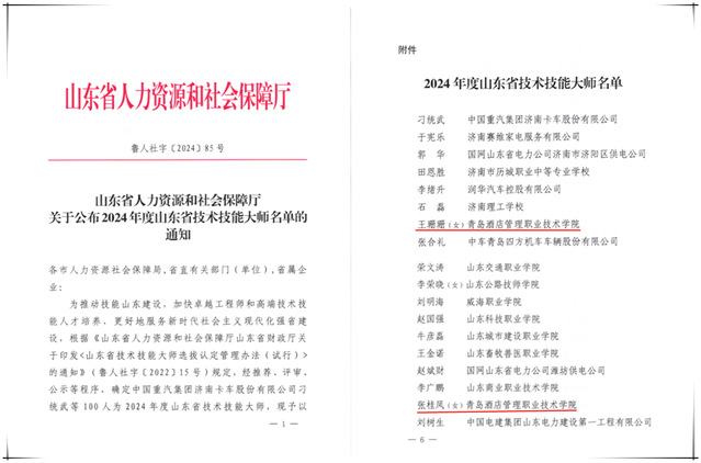 本网讯(组织人事处 教师工作部)近日,山东省人力资源和社会保障厅公布了2024年度山东省技术技能大师名单,万象城官网烹饪学院王珊珊、张桂凤2名教师位列其中。截至目前,学校已有4名教师获评“山东省技术技能大师”。