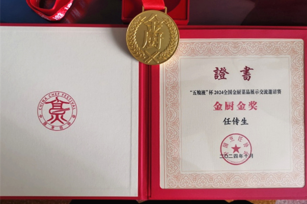 本网讯(烹饪学院 刘卜玮)近日,由中国烹饪协会主办的“五粮液杯”2024全国金厨菜品展示交流邀请赛在四川省宜宾市举行,学校烹饪学院教师任传生喜获金厨金奖。