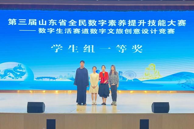 本网讯(文旅学院 王婷婷)11月23日,第三届山东省全民数字素养提升技能大赛数字生活赛道数字文旅创意设计竞赛在烟台举行,学校文旅学院文化创意与策划专业学生韩欣缘、韩乐、纪如翼团队荣获学生组一等奖第一名,王婷婷获评优秀指导教师。