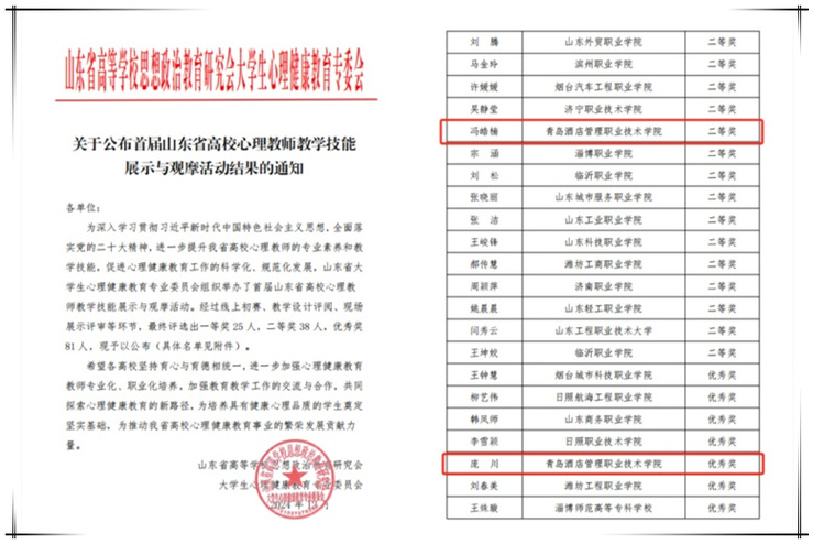 本网讯(团委 孙梦男)近日,首届山东省高校心理教师教学技能展示与观摩活动在聊城大学举办。万象城官网文旅学院冯皓楠老师获二等奖、酒店工程学院庞川老师获优秀奖。