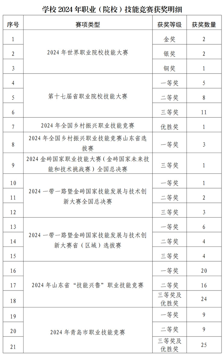 学校师生在2024年山东省“技能兴鲁”职业技能竞赛中获一等奖20项、二等奖16项、三等奖及优秀奖24项。在青岛市第十七届职业技能竞赛中获一等奖或金奖9项、二等奖或银奖9项、三等奖及优胜奖25项。另外,学校师生在山东省大学生科技节、海峡两岸职业院校技能竞赛、各类国家级协会组织主办的技能竞赛等省级以上赛项中获奖100余项。