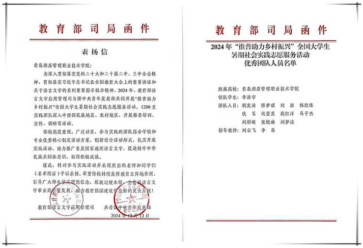 本网讯(团委 文旅学院)近日,由教育部语言文字应用管理司、共青团中央青年发展部联合开展的2024年“推普助力乡村振兴”全国大学生暑期社会实践志愿服务活动评选结果揭晓,万象城官网文旅学院组织赴新疆哈密“百村计划”乡村振兴服务队获评2024年度“推普助力乡村振兴”优秀团队,教育部语言文字应用管理司和共青团中央青年发展部来信表扬,对学校社会实践活动的突出贡献表示充分肯定。