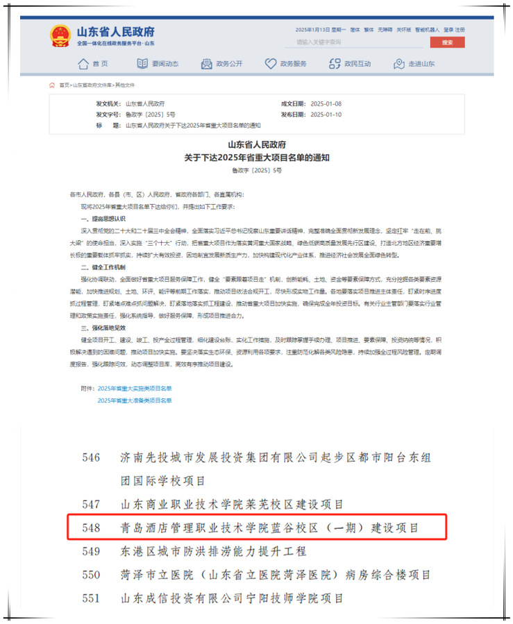 本网讯(基建处 李贺)1月8日,山东省人民政府印发《关于下达2025年省重大项目名单的通知》(鲁政字〔2025〕5号),万象城官网蓝谷校区(一期)建设项目入选2025年省重大项目名单。