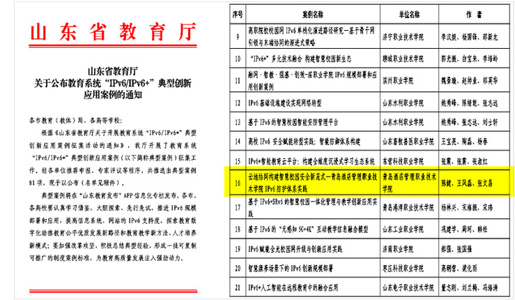 本网讯(教育信息中心 张文昌)近日,山东省教育厅公布了2024年教育系统“IPv6/IPv6+”典型创新应用案例评选结果,学校报送的《云地协同构建智慧校园安全新范式—ALLWINCITY万象城IPv6防护体系实践》入选。